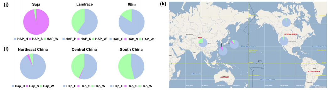 在栽培大豆中,GmMFT存在二种主要单倍型,分别为高产高油材料华春2号携带的GmMFT_H型和华南地方资源瓦窑黄豆携带的GmMFT_W型。GmMFT_H和GmMFT_W存在明显的地里分布差异,高产高油单倍型GmMFT_H在美国和我国东北地区被显著选择,而其在我国低纬度地区的频率显著低于东北地区,表明GmMFT_H有可能会成为低纬度地区高产高油大豆分子设计育种的潜在核心靶基因之一。